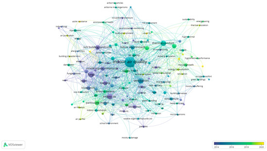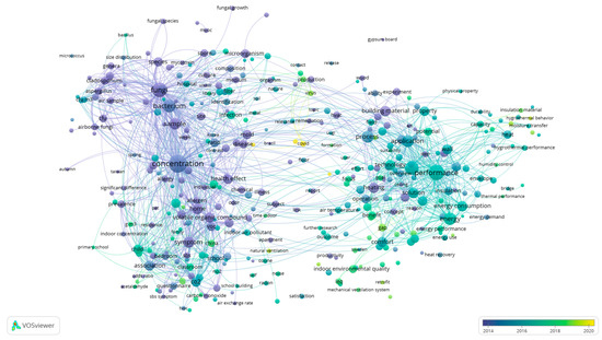 The overlay map based on terms in the title and abstract (Figure 3) shows two distinctive clusters around “concentration” (on the left-hand side) and “performance” (on the right-hand side). The color contrast between these two clusters revealed a focus shift from fungal concentration aspects and health effects (having a peak period around 2014) towards performance assessment in buildings (around 2017) and solutions via humidity control, materials, and other technologies, such as air purifiers (beyond 2020).