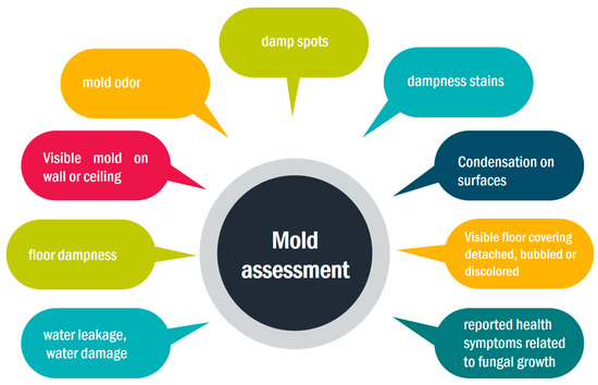 Wang et al. [73] conducted an extensive questionnaire-based survey campaign (40,279 questionnaires) in eight Chinese cities to investigate the perceived indoor air quality and home environment. The results disclosed a relationship between mold and odors and climatic conditions. In particular, visible mold or damp stains and mold odor are more common in cities of south China, characterized by higher mean ambient temperature. Also, these phenomena are more frequent in old buildings. Moreover, the study highlighted other associated factors for mold and dampness in the home, including pets and pests (rats/mice, cockroaches), low ventilation levels, and inadequate cleaning. A correlation was also found between dampness/mold, allergic rhinitis or asthma in adults, and the perception of odors. An observational assessment tool was developed by Park and Cox-Ganser [74] for evaluating indoor dampness and mold. The tool is based on visual and olfactory inspections and uses a standardized evaluation form supplemented by a questionnaire about the participants’ respiratory diseases. Water stains, visible mold, mold odor, and moisture are detected, and their magnitude is scored based on intensity or size. All building components are included in the assessment (walls, ceiling, floor, windows, furniture, ventilation systems, pipes, and materials). The results showed significant associations between the individual exposure index and building-related respiratory symptoms. The proposed dampness and mold assessment sheet can be used for an initial assessment of building moisture and mold presence or following a water damage incident. Nevertheless, indoor microbial assessment cannot rely entirely on questionnaires, as occupants are often unaware of the mold-related problems in their homes, especially when it comes to hidden fungal growth.
