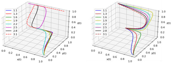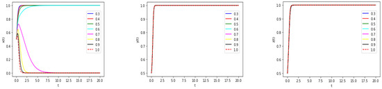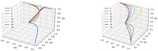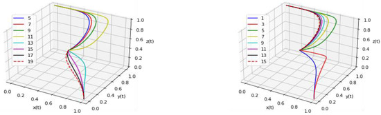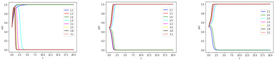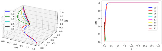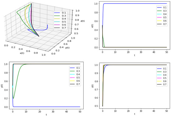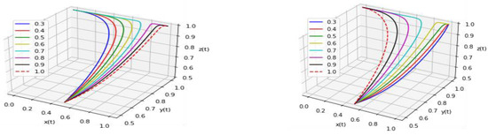 In Figure 2, Figure 3, Figure 4, Figure 5, Figure 6, Figure 7, Figure 8, Figure 9, Figure 10 and Figure 11, represents the change in government incentive mechanism over time. When approaches 1, the probability of the government choosing to implement incentives for the whole-process engineering consulting company approaches 1, and the probability of the government choosing to implement incentives for social capital approaches 0. represents the change in the behavior choice of social capital over time. When approaches 1, the probability of social capital choosing to actively cooperate approaches 1, and the probability of social capital choosing to passively cooperate approaches 0. When approaches 1, the probability of the whole-process engineering consulting company choosing to actively participate approaches 1, and the probability of the whole-process engineering consulting company choosing to passively participate approaches 0.
