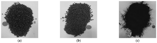 According to the previous studies [6,7,8,9,10,11,12,13,14], three widely used high-modulus admixtures (i.e., RA, PR.M, and BRA) were adopted to prepare the HMAM in this study. RA is provided by Sichuan Kelutai Transportation Technology Co., Ltd. (Chengdu, China) (Figure 1a). It is an alloy resin material, of which the density is 0.96 g/cm3. PR.M is provided by Sichuan Mingdelai Technology Co., Ltd. (Chengdu, China) (Figure 1b). It is a thermoplastic resin material, of which the density is 0.95 g/cm3. BRA is provided by Sichuan Shengxiang Chemical Technology Co., LTD (Chengdu, China) (Figure 1c). It is a kind of natural asphalt, of which the density is 0.96 g/cm3. According to the suppliers’ recommendation, the content ranges of RA, PRM, and BRA used in this study are 0.35–0.45%, 0.40–0.50%, and 3.0–4.0%, respectively.