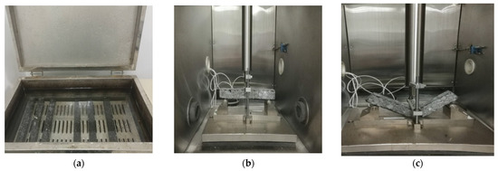 The specimens were formed by wheel rolling method according to the specifications and cut into beam specimens with a length of 380 ± 5 mm, a thickness of 50 ± 5 mm, and a width of 63.5 ± 5 mm. The fatigue tests were carried out at 15 °C and 40 °C. Before the fatigue tests, the specimens should be immersed in water at a constant temperature (Figure 2a) which was equal to the temperature used in fatigue tests. Three parallel tests were successfully implemented for each group (Figure 2b,c). The loading frequency is 10 Hz under stress-controlled condition.