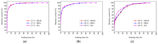Curves of moisture content of RA, PR.M, and BRA at 15 °C, 40 °C, and 60 °C are plotted in Figure 3a, Figure 3b and Figure 3c respectively. For example, in the figures, “15 °C-PR.M” indicates the change of moisture content of PR.M with soaking time under the condition of 15 °C.