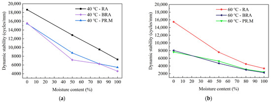 As can be seen from Figure 4, the dynamic stability of the HMAM is not only related to temperature but also significantly decreases with the increase in moisture content. Moisture content has a great influence on the dynamic stability of the HMAM. Under the condition of 40 °C, the relative moisture content of RA, PR.M, and BRA is 0%, and when the moisture content is 50%, 80%, and 100%, respectively, the average dynamic stability decreases by 42.8%, 22.3%, and 21.1%, respectively. The dynamic stability does not decrease linearly with the increase in moisture content. When the temperature rises to 60 °C, there is an approximate change rule. At the same time, under any conditions, the dynamic stability of the RA asphalt mixture is higher than that of PR.M and BRA. The main reason may be that RA is mainly composed of rock asphalt and resin alloys, which can optimize the properties of different polymers and significantly improve the properties of materials. However, PR.M and BRA are primarily composed of high melting point materials that perform poorly at low temperatures.
