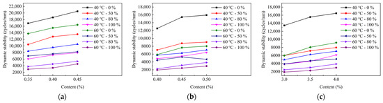 The dynamic stability curve of the HMAM with the same type of control admixture and different content is shown in Figure 5. For example, in the figures, “40 °C–50%” indicates the change of dynamic stability of the asphalt mixture with the moisture content of 50% at 40 °C.
