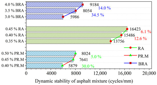 When the dynamic stabilities of the three HMAMs with different admixture contents are compared, it is discovered that when the content of RA is 0.4%, it is 12.6% higher than 0.35%, and when the content is increased to 0.45%, it is only 6.1% higher. When the content of PR.M is 0.45%, the dynamic stability is increased by 30.0% compared with 0.4%. When the content is increased to 0.5%, the dynamic stability is only increased by 5.0%. When the content of BRA is 3.5%, it is 34.5% higher than 3.0%, and when the content is increased to 4.0%, it is only 14.0% higher. Therefore, the optimal content of PR.M, RA, and BRA is 0.45%, 0.4%, and 3.5%, respectively.