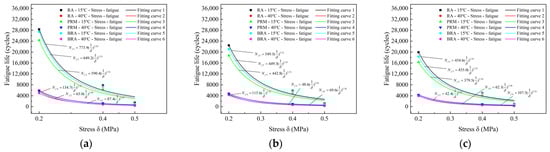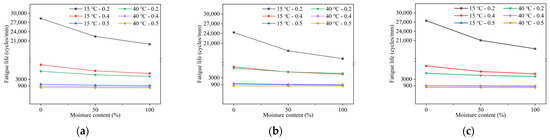The stress-fatigue curves of the three HMAMs with a moisture content of 0%, 50%, and 100% at different temperatures were drawn based on the above experimental results, as shown in Figure 9. For example, in the figures, “15 °C-stress-fatigue” indicates the fatigue life at 15 °C.