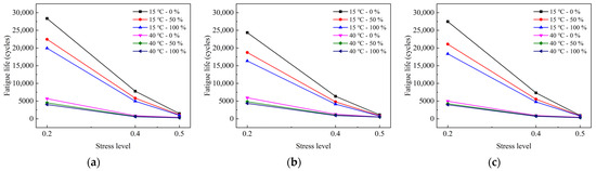Figure 8 illustrates the relationship between stress levels and fatigue life of the three HMAMs at different moisture contents and temperatures. For example, in the figures, “15 °C–0%” indicates the change of fatigue life of asphalt mixture with different stress levels under the condition of 15 °C and moisture content of 0%.