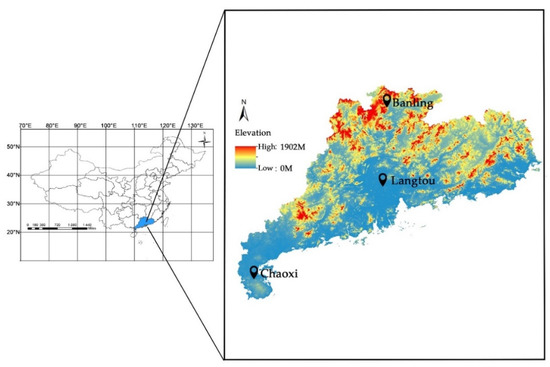 Map of Lingnan indicating the three traditional settlements under study relative to the topography.
