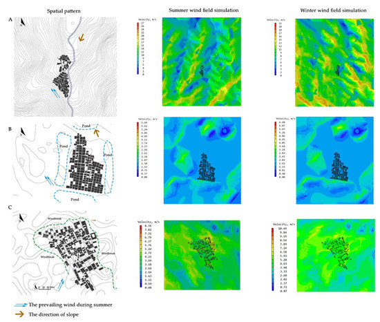 Wind field simulation and spatial pattern map of (A) Banling (T1), (B) Langtou (T2), and (C) Chaoxi (T3).