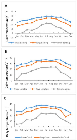 Minimum, mean, and maximum air temperature for (A) Banling (T1), (B) Langtou (T2), and (C) Chaoxi (T3). Source: National Meteorological Science Date Center, China.