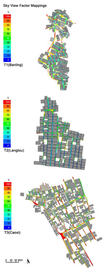 In the case of Chaoxi (T3), the SVF mappings at the street level show that high SVF, which ranges from 0.40~0.80, accounts for 52.9% of the streetscape area (Table 5, Figure 4). This indicates that the majority of the settlement’s streetscape has a relatively high SVF. This can be attributed to the presence of low-rise buildings and the semi-dispersed configuration of the settlement. In contrast, the low SVF range of 0.01 to 0.40 only covers 8.1% of the streetscapes area. High SVF values in the range of 0.81–0.90 and 0.91–1 accounted for 16.2% and 15.6% of the streetscapes area, respectively. In the widened streetscapes along the buildings, high SVF was simulated. In summer, most settlements’ streetscapes are exposed to incident solar radiation, with a shading rate of only 28.4%, which provides an uncomfortable walking experience for pedestrians. In winter, the shading rises to 49.5% (Table 4, Figure 5).