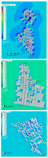 Analyses of wind speed mappings indicate (Figure 6) that the wind speed of 0.7 m/s ~5.0 m/s accounts for 41% of the streetscape area. The maximum wind speed zone in Banling (T1) occurs at A-1, with a wind speed of 7 m/s~12 m/s, and the minimum wind speed zone occurs at A-2 with a wind speed of <0.7m/s. Ventilation street corridors are formed in A-S-1 and A-S-2, probably because street corridors are in the same direction as the prevailing wind and the continuous and narrow street corridors (S–N orientation) with small directional angles (<30°). In contrast, the occurrence of continuous large areas with wind speeds >5.0 m/s may be attributed to the constraints imposed by the mountainous terrain on the settlement, resulting in winding and meandering streets corridors. Additionally, the presence of certain buildings and street corridors with significant angles (>60°) relative to the prevailing wind direction could contribute to the formation of these high wind speed zones. More specially, under the influence of vertical wind direction, some areas of A-S-2, A2, and A1 may form three patterns of isolated bypass flow, mutual influence bypass flow, and glide flow, and include the “Street Canyon Effect” in the middle of the street and at the corners.