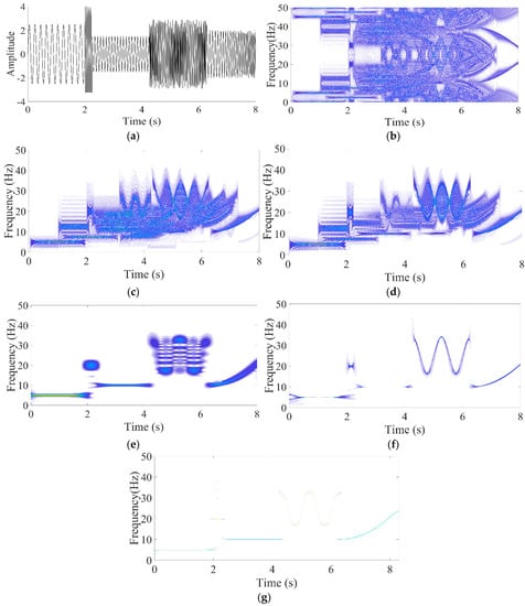 The multi-component signal contains five components with epochs of 2 s, 0.23 s, 1.76 s, and 2 s for the rest of the components, respectively. The time domain representation of a signal is plotted in Figure 1a with a sampling frequency of 100 Hz. The synthetic signal is processed with the help of the WD, WVD, PWVD, SPWVD, SST, and LMSST methods, and the results are plotted in Figure 1b–g, respectively.