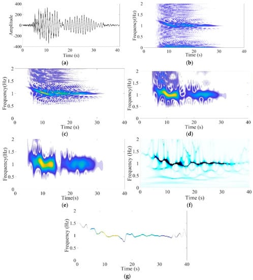 From Figure 2g, it can be observed that the pre-seismic frequency of the building is around 1.5 Hz. During the co-seismic phase, the frequency of the building gradually decreases, and in the post-seismic phase, it tries to regain the natural frequency but fails to regain it. A substantial shift of around 33% is recorded. As reported in [], the building is said to be damaged if its natural frequency is changed by 5%. Thus, it can be concluded that the building was damaged by the earthquake. Building assessment reports after the earthquake and the results obtained by [,] are in line with our findings. The Renyi entropies obtained for all TF methods are listed in Table 3, where LMSST yields minimum entropy.