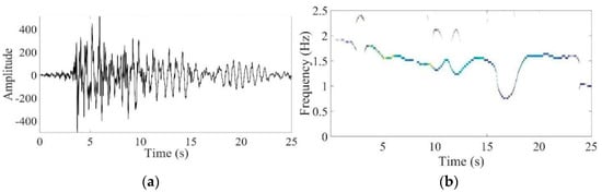 A 10-story residential building was designed in 1974 in Northridge. Before the earthquake, four accelerometer sensors were installed on the first, fourth, and eighth floors of the building. Earthquake data were collected from the top floor of the building for approximately 60 s. Only the seismic signals for the first 25 s are analyzed because the remaining signals do not provide useful information. The time-domain representations of the signals and their LMSST responses could be seen in Figure 3a,b, respectively.