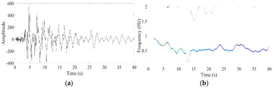 The seven-story Van Nuys Hotel was built in 1966. The hotel was lavishly outfitted with sensors on every floor. The time history data of the earthquake collected from the building’s roof, as well as the time–frequency responses obtained with the LMSST technique, are plotted in Figure 4a,b, respectively. From the figures, it can be observed that the pre-event frequency of the building was around 1 Hz, and during the earthquake, it gradually decreased down to 0.5 Hz. After the earthquake, the building tried to regain its pre-event frequency but could not achieve it. The post-event frequency dropped by almost 50%. Thus, it can be concluded that the building was permanently damaged by the earthquake, as also reported on the website (http://www.strongmotioncenter.org/vdc/scripts/download_tar.plx).