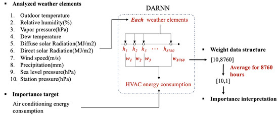 Figure 1 provides an overview of the process of using the DARNN to predict the air-conditioning energy consumption based on weather elements. The attention mechanism in the neural network calculates the weights for each weather element with respect to the target prediction. Since a total of 10 weather elements are considered, each with a time span of one year (8760 h), the resulting weight data structure is [10, 8760]. To facilitate statistical analysis, the weight data structure is transformed into [10, 1] by taking the average along the time dimension, serving as the final outcome of importance interpretation.