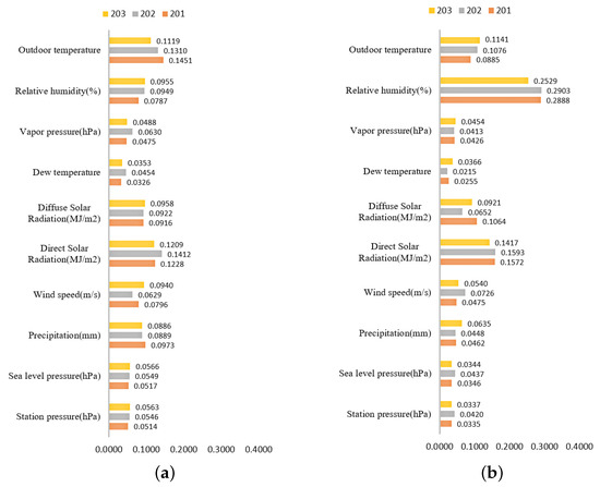 Taking three units on the middle floor of the building as representatives, namely, units 201, 202, and 203, and considering the importance of weather elements to the air-conditioning energy consumption in winter and summer, the importance interpretation results of the DARNN are shown in Figure 2. The 2019 dataset was used as the training set for the DARNN, and the July and December 2020 datasets were used as the test set. The results show that in both winter (December) and summer (August), the three most important factors were solar radiation, outdoor temperature, and relative humidity.