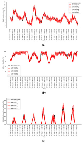 Based on the importance interpretation results, solar radiation, relative humidity, and outdoor temperature were used as uncertainty modeling objects. As there are latent correlations between weather elements, weather elements other than those mentioned above are used as input values for the Bayesian-RNN, and the outputs are the uncertainty models of the object weather elements, as shown in Figure 3, and the details of the hyperparameters are shown in Table 3. The result of uncertainty modeling was that 8760 normal distribution models were established for each element, that is, one normal distribution model at each hour of the year, to reflect the change in weather elements over time. The predictive accuracy and underlying principles of the Bayesian-RNN for weather uncertainty have been validated in the paper [20].
