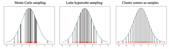 The Monte Carlo and Latin hypercube samplings are commonly used traditional sampling methods. However, due to the reliance on randomness in the sampling process, there are instances where the representativeness of the sampling results cannot be guaranteed. In this study, these two methods are used as benchmarks for comparing the sampling effectiveness of clustering algorithms. As the sampling objects in this study are multiple normal distributions, to compare the representativeness of the sampling results in the sample space between the clustering algorithm and the traditional sampling method with a small number of samples, the standard normal distribution with a mean of 0 and a standard deviation of 1 was sampled 25 times using the Monte Carlo method and the Latin hypercube method. In addition, for the same normal distribution, 100,000 samples were first randomly selected, and, thereafter, the samples were clustered using the k-means algorithm to obtain 25 cluster centers as 25 samples, as shown in Figure 5.