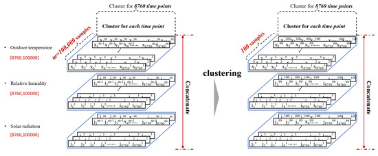 Each weather element was sampled 100,000 times based on the normal distribution at each hour; thus, the sampling data results with the structure [8760, 100,000] were obtained. As there are three weather elements, the final data structure obtained through the sampling process is [3, 8760, 100,000]. The dimension of the number of samples was clustered to obtain 100 cluster centers due to which the data structure became [3, 8760, 100], as shown in Figure 6. Thus, there were 100 clustering centers as samples at each hour of the three weather elements.