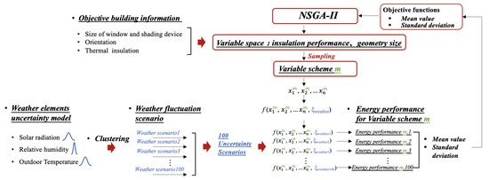 where x denotes the optimization variables, denotes the mth set of building schemes selected from the variable space, denotes each variable in the mth building scheme (such as the building orientation and window size), and indicates the weather uncertainty scenarios generated in Section 3.2.