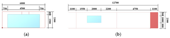 In this study, an LDK south-facing three-story MUH with three units on each floor has been considered. One LDK (living room, dining, and kitchen), bedroom, toilet, entrance with a corridor in each unit, plan of each floor, and size of each unit are shown in Figure 8. All units have exterior windows on the south wall of the LDK and on the bedroom walls of the east- and west-side units; the facade size of the unit is shown in Figure 9, with the west unit as an example.