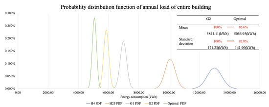 One hundred weather uncertainty scenarios were generated as described in Section 2.2.2; thus, there were 100 energy performance results for each design scheme. Figure 10 shows the air-conditioning energy consumption results of an entire building for thermal insulation standards H4, H25, G1, and G2 (5th climate zone) and the optimal scheme, i.e., the probability distribution function (PDF) curve generated based on the mean and standard deviation of 100 results. For the four thermal insulation standards on the display, G2 had the ideal mean and standard deviation, that is, the lowest mean and smallest standard deviation.