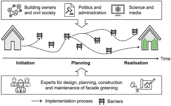 Following Mosgaard and Maneschi [] and Andrić et al. [], GF implementation can be seen as a three-stage innovation process: from initiation, where actors realize that implementing GF is possible, useful, or even necessary; to planning, where actors work together to find a joint solution; to realization, i.e., installation and maintenance of the GF. The process requires transdisciplinary and cross-actor collaboration between citizens, building owners and managers, professional and scientific experts (e.g., from the fields of landscape architecture and planning, engineering, construction, and horticulture) as well as politicians and public administrators [,,,,]. In the process, these actors are usually confronted with numerous barriers that compromise (successful) GF implementation (see Figure 1).