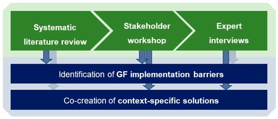 The analysis of barriers and solutions presented in this study followed the research process illustrated in Figure 2. The study involved a systematic literature review, followed by a stakeholder workshop and subsequent expert interviews. The participatory process was carried out as part of a case study in Leipzig, Germany, to exemplarily confirm and complement previous literature findings on GF implementation barriers in the local context. To overcome them, context-specific solutions were created in collaboration with various local stakeholders and GF experts.