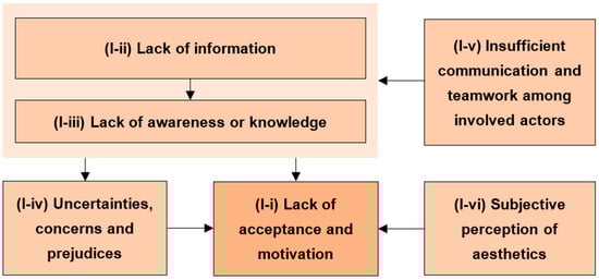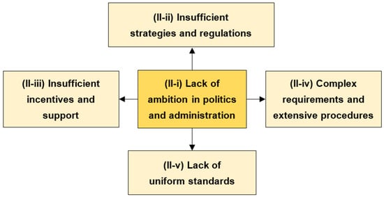 Social (actor-specific) barriers are mentioned in 17 of the 20 analyzed publications and by various Leipzig stakeholders and experts, confirming that these are among the most significant GF implementation barriers. First and foremost, there is a (I-i) lack of acceptance and motivation for GF implementation, as mentioned both by the literature and in Leipzig [,]. This central barrier is also reflected in the central barriers in category (II) and (III), respectively, highlighting the insufficient political and financial support for GF. The case study confirms, that (I-i) is primarily influenced by the (I-ii) lack of (objective) information and consequently (I-iii) awareness or knowledge about the existence, cost and benefit, and practical-technical execution of GF []. A GF consultant from Leipzig substantiated this by claiming that the public has frequently internalized false information. This is due to insufficient public relations and many improperly implemented GF, which negatively influences the perception of the involved actors [,]. Thus, (I-iv) uncertainties, concerns, and prejudices regarding the practical-technical execution of GF and potential hazards for buildings and residents arise, as was also reflected by Leipzig stakeholders [,,]. Particularly, the practical-technical complexity as well as the cost and maintenance effort are perceived as a hurdle for GF implementation [,]. According to the literature, as well as local stakeholders and experts, (I-ii) and (I-iii) are therefore major barriers (ibid.). Since the involved actors have very different occupational environments, knowledge, and goals, the (I-v) communication, coordination, and teamwork between them are often insufficient [,]. The case study confirmed that this hinders the flow of information on GFs, thereby not only negatively influencing social acceptance but also the proper practical-technical execution of GFs (cf. I-i, IV-i; [,]). The literature and case study findings show that, irrespective of the informational situation, the (I-vi) subjective perception of aesthetics can also act as a barrier because some actors see the greening as abnormal or messy [,].