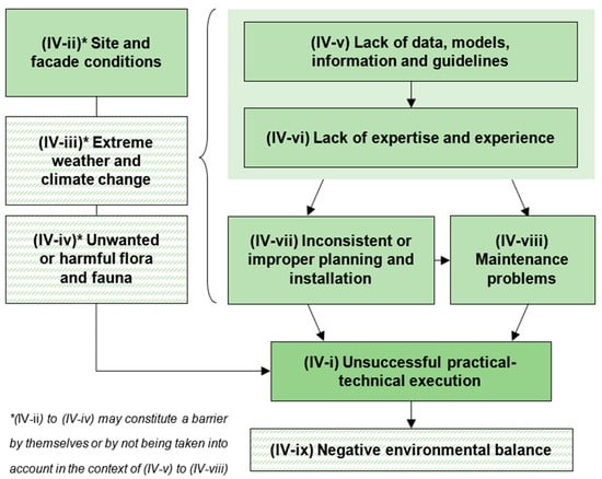 In total, 13 publications and various Leipzig stakeholders and experts addressed barriers to the practical-technical implementation of GFs. While eight papers also address environmental barriers, these were hardly a concern in the case study. Due to their close interconnection, practical-technical and environmental barriers are considered together. The central consequence of the barriers in category (IV) is the (IV-i) unsuccessful practical-technical execution of GFs, meaning that the greening fails, i.e., the facade is not or only sparsely covered, or that it has negative effects on the system, the building, or its residents, as frequently experienced by Leipzig stakeholders and experts. Successful execution can initially be hindered by three barriers, all of which are highly dependent on the study area. The first barrier consists of the (IV-ii) site and facade conditions, for not all facades are suitable for GF installation [,]. This was confirmed by local stakeholders and includes, according to the consulted GF experts, e.g., sites above a geographic height of 600 m above sea level and facades with a complicated wall structure. Secondly, (IV-iii) extreme weather and climate changes can affect the success of GFs, yet this was not brought up in Leipzig [,]. Lastly, (IV-iv) unwanted or harmful flora and fauna can cause trouble at the site or facade [,,]. Leipzig stakeholders and experts underlined the problem of potentially invasive species. However, the case study showed that (IV-ii) to (IV-iv) primarily become a barrier if not taken into account during the implementation process. GFs are complex systems with multiple components that need to be well thought through. This is why the (IV-v) lack of data, models, information, and guidelines as well as of (IV-vi) expertise and practical experience in GF implementation are major barriers in this context [,,]. This pertains to specialist information and knowledge about political-administrative requirements (cf. II-iv) and about proper planning, installation, care, and maintenance of GFs [,,]. Together, (IV-v) und (IV-vi) are addressed in over half of the reviewed publications and were also emphasized in the case study. The two barriers depend, e.g., on the flow of information on the social level (cf. I-ii, I-v) and on the market conditions, respectively, as well as the availability of corresponding experts, as noted by respective GF experts []. Both barriers can lead to (IV-vii) inconsistent or improper planning and installation as well as to (IV-viii) maintenance problems []. These problems include the negligence of maintenance requirements, either due to lack of know-how (cf. IV-v, IV-vi) or due to high effort and actors’ lack of willingness (cf. I-i, III-I; e.g., [,]. The maintenance effort can also be increased by (IV-vii), reinforcing economic barriers (cf. III-iii; []). (IV-vii) and (IV-viii) were not only repeatedly confirmed in the case study but are, according to the consulted stakeholders and experts, significant barriers in Leipzig, as they cause GFs to fail. As per the literature and the case study, this can not only reduce actors’ willingness to implement and support GFs in the future (cf. I-i, II-i, III-i) as well as the return on investment (cf. III-iv) but can also have a (IV-ix) negative impact on the environment because the preceding consumption of resources for installation and maintenance can no longer be balanced out by the environmental benefits provided by the GF [,,].