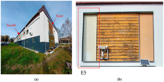 Experimental timber-framed walls: (a) Placement within the research center of UNIZA in Žilina; (b) East view of selected fragment E5.