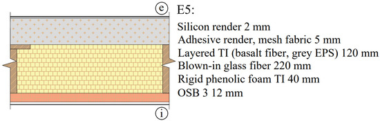 The main characteristics of the materials are in Table 1. The framing consists of solid structural timber 60 mm × 220 mm and is filled with glass fiber blown-in insulation. The outer layers are formed by silicon and adhesive render with mesh fabric on top of a layered TI (basalt fiber 80 mm and grey EPS 40 mm). The inner layers are rigid phenolic foam board and OSB (Figure 3). The loose-fill mineral insulation consists of thoroughly hydrophobized glass fibers, resistant to mold, fungus, and insects. The heat transfer coefficient, calculated according to European standards for inhomogeneous structures [21], is U = 0.1 W/(m2.K).