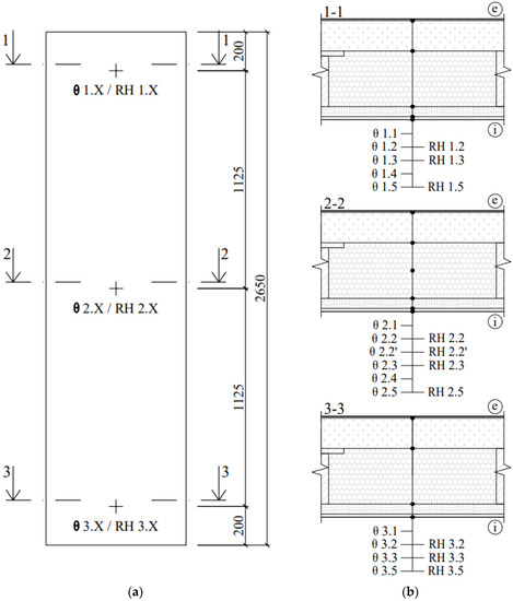 Wall sample E5: (a) interior view on wall segment E5 with vertical sensors positioning, where X stands for cross-section position; (b) wall cross-sections with probes placement.