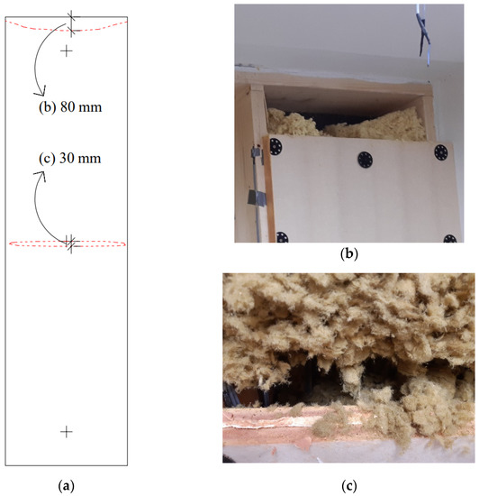 For better representation, Figure 5a shows the positioning of the critical air gaps. The primary air cavity, reaching 80 mm throughout the whole wall thickness, was discovered on top of the wall sample, presumably due to material settlement (Figure 5b).