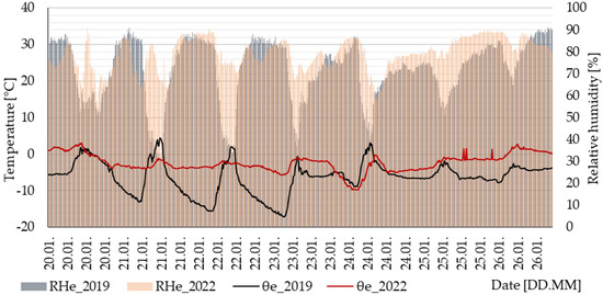 Exterior relative humidity and temperature during the coldest week of 2019 and 2022.