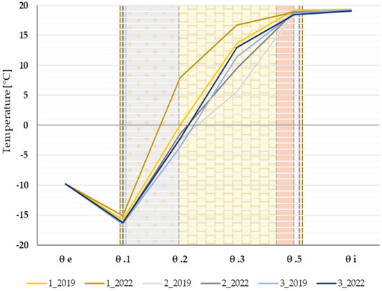 Figure 10 depicts the temperature development through the wall cross-section for the various vertical positioning—yellow for the upper post (1), grey in the middle (2), and blue on the bottom level (3). The X-axis represents different probe placements according to Figure 4, illustrated by the see-through cross-section.