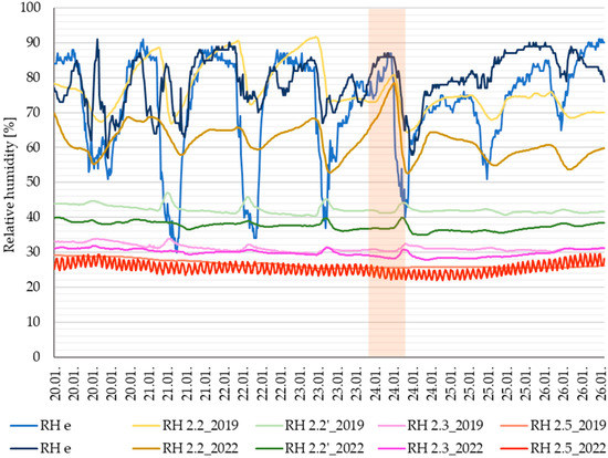 To represent the consequences of air gapping, we need to select the most dangerous moment, which is the minimal exterior temperature, accompanied inevitably by maximal relative humidity. This phenomenon is tricky to establish because of the fact that the minimum temperature in 2022 was 7.4 °C, lower than three years prior. Therefore, the selected moment was established on January 24th. The outside temperature in both years reached −9.8 °C, while the relative humidity was 87%.