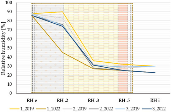 Figure 12 shows relative humidity development through the wall cross-section during identical exterior conditions. A different color distinguishes each vertical level: yellow for the highest level, grey in the middle, and blue just above the ground, while values in 2019 use lighter color shades compared to 2022.
