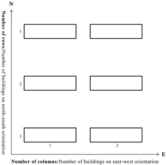 In this paper, through the research of small-scale residential blocks in the study area, the row layout is selected as the building plan combination form. Row layout is conducive to light and ventilation and is a more commonly used building group layout mode. Nine building layout types were extracted using the number of rows and columns of buildings as the parameter variables (as shown in Figure 5, the number of rows refers to the number of buildings in north–south orientation, and the number of columns refers to the number of buildings on east–west orientation) in the row layout (Figure 6). Considering the scale of the street block and building size, the number of rows and columns is set to 1–3, respectively. To keep the building floor area ratio in the block constant, the building height decreases with the increase in the number of rows. According to the regulation that the height of residential buildings in Jinan shall not be greater than 80 m, the building height is set at 72 m (24 floors), 36 m (12 floors), and 24 m (8 floors). Combining the requirements for daylight spacing in the above relevant specifications and taking into account the differences in the design of daylight spacing between multi-story and high-rise buildings, the N–S and E–W spacing of buildings is set. In order to facilitate the calculation of floor area and data processing analysis, it is assumed that the building density is the same in the model with the same number of rows. Only N–S and E–W orientations are selected for street orientation in this study, which is the main orientation of streets in residential blocks in Jinan. Nine different base block unit models were formed by combining the number of rows and columns (Table 1) and labeling them based on rows and columns.