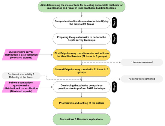 This statement describes the methodology of a study that aims to identify the most appropriate maintenance and repair (M&R) processes for healthcare building facilities (HBFs) in Iraq. The study is conducted in a developing nation context, which means that the researchers need to consider various factors specific to that context, such as resource availability and infrastructure limitations. To achieve the objective of the study, the researchers divided it into three independent steps. Figure 1 provides a visual representation of these sections. In the first and second steps, the most relevant criteria and indicators for selecting M&R processes for HBFs were identified. To do this, a comprehensive review of the existing scholarly literature on the subject was conducted. In the second step, two rounds of the Delphi survey were carried out, which is a structured communication method that aims to reach a consensus among experts on a particular topic. The Delphi survey is particularly useful when confronting complex and uncertain issues. In this case, the researchers used it to gather opinions from a panel of experts on M&R processes for HBFs in Iraq. The Delphi survey allowed the researchers to identify the most relevant criteria and indicators that experts deemed important for selecting M&R processes in this context. Overall, the study provides guidance for decision makers in Iraq on how to select the most appropriate M&R processes for HBFs. By identifying the most relevant criteria and indicators for this purpose, the study can help ensure that HBFs are properly maintained and repaired, which is essential for providing quality healthcare services. Eventually, in the third step, the fuzzy analytic hierarchy process (FAHP) technique was used for the prioritization of identified criteria.
