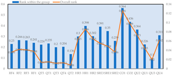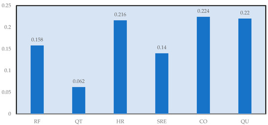 Using the FAHP approach, the relative importance of sub-criteria within each category was determined. Table 6 displays the results and weights associated with the sub-criteria. According to Figure 4, sub-criteria RF2 and RF3 rated first and second, respectively, in terms of importance for the RF group. Moreover, RF1 and RF4 were ranked third and fourth, respectively. FT1 sub-criteria rated first, FT5 sub-criteria ranked second, and FT4, FT3, and FT2 sub-criteria placed third through fifth for the FT group, respectively. In terms of relevance, sub-criteria HR1 and HR2 ranked first and second in the HR group, respectively, while sub-criteria HR3 ranked third. The ranking of the group of SRE criteria revealed that the SRE3 sub-criteria rated highest, followed by the SRE1 and SRE2 sub-criteria, in that order. The CO1 and CO2 sub-criteria were also placed first and second for the CO group. The ranking of the QU group reveals that sub-criteria QU2 and QU4 ranked first and second, respectively, followed by sub-criteria QU1 and QU3 in third and fourth ranks, respectively. Figure 4 depicts the overall ranking of the criteria and sub-criteria. In a comparison of all sub-criteria, the CO1 sub-criteria ranked highest, while the FT2 sub-criteria ranked lowest.