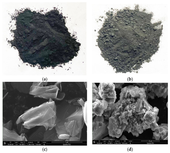 Conductive filler sample diagram. (a) Nanographite sample diagram; (b) Magnetite sand sample diagram; (c) Nanographite SEM diagram; (d) Magnetite sand of SEM diagram.