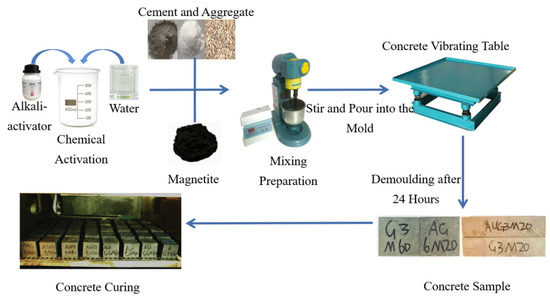 Figure 2 shows magnetite samples before and after excitation. Figure 3 shows the preparation steps of alkali-activated conductive concrete.