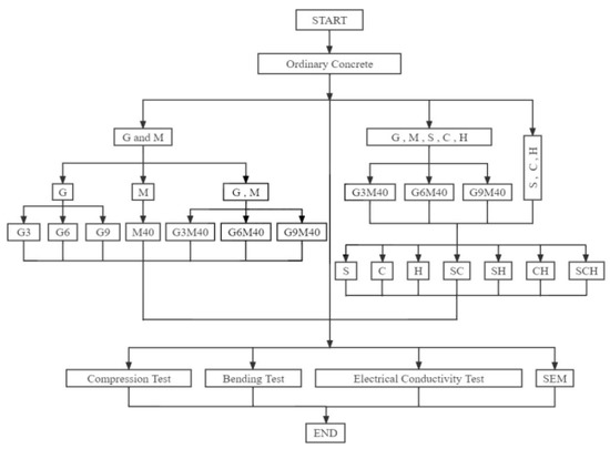 In the block diagram and the table below, the letters S, C, H, SC, SH, CH and SCH signify to excite with sodium sulfate, with calcium hydroxide, with sodium hydroxide, with sodium sulfate and calcium hydroxide, with sodium sulfate and sodium hydroxide, with calcium hydroxide and sodium sulfate, and with three kinds of activators, respectively. The numbers 3, 6 and 9 represent the percentages of nanographite of 3%, 6% and 9%, respectively, and the sand replaced by magnetite sand is represented by the number 40, which indicates that the amount of magnetite sand incorporated is 40% by weight of sand.