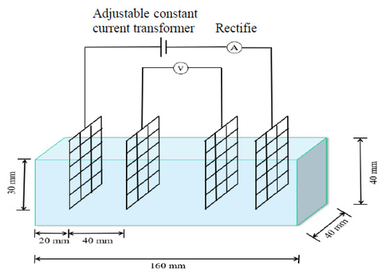 The size of the specimen is 40 mm × 40 mm × 160 mm, and the metal mesh electrodes of 30 mm × 80 mm are parallelly embedded in the specimen.