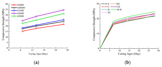 Comparing the compressive strength of G0M0 and S-SCH, it can be found that the early strength of concrete can be improved by adding the alkaline activator, and the strength of concrete can be improved by adding the alkaline activator properly, but the effect of concrete strength improvement caused by alkali activation without magnetite sand is very little.