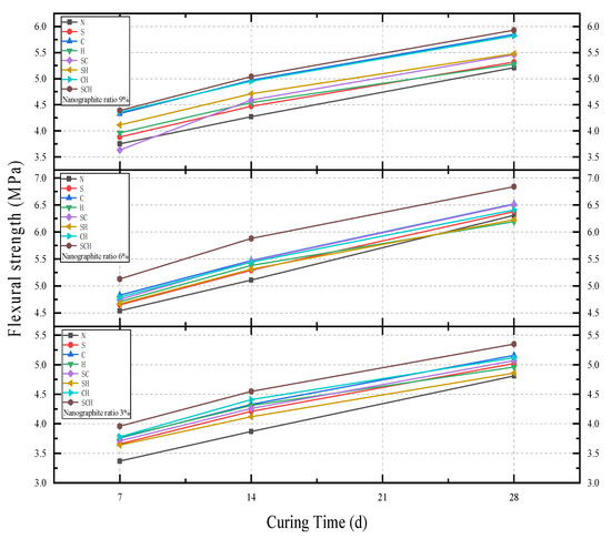 Figure 9 compares the effects of different chemical excitation modes on the flexural strength of three kinds of concrete specimens with different amounts of nanographite admixture under different curing ages. The amount of nanographite admixture is 6%, the content of magnetite is 40%, and the flexural strength of the experimental group excited by three kinds of activators reached 6.84 MPa. It can be seen from Figure 8 that the change in flexural strength of alkali-activated conductive concrete is similar to its compressive strength. To sum up, the combination of three activators (the mass ratio of sodium sulfate, calcium hydroxide and sodium hydroxide is 1:1:1) is the best excitation mode, which can effectively stimulate the activity of magnetite sand mixed with concrete. especially for concrete specimens with a high content of magnetite sand and nanographite (such as 40% magnetite and 6% nanographite). The reason is that some of the nanographite fills the micro-pores of magnetite, which hinders the agglomeration of nanographite, reduces the local strength of the flexural test block due to nanographite agglomeration, and improves the flexural strength of the specimen.