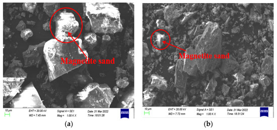 Figure 12 is the SEM diagram of magnetite sand under different modification conditions. It can be observed from the figure that the increase in alkali content can reduce the particle size of magnetite sand, fill the micro-void of concrete to a certain extent, and then improve the strength of concrete. However, excessive alkali content can also lead to a decrease in concrete strength. From Figure 12h (SEM diagram of the specimen excited by three kinds of activators) and Table 4, Table 5, Table 6 and Table 7, it can be seen that the compressive strength of the specimen excited by three kinds of activators is the highest, which further verifies that the strength of alkali-excited conductive concrete is correlated to the alkali content of the activator.